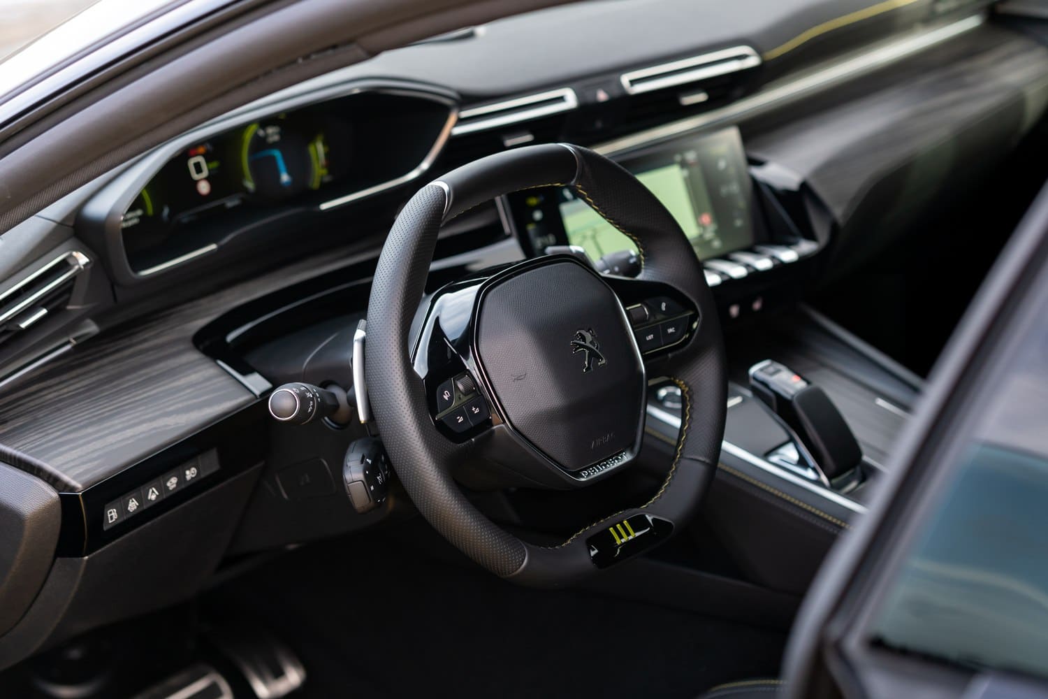 C’est que la 508 PSE dispose de quatre roues motrices, grâce à un moteur électrique sur le train arrière. Un deuxième bloc électrique est logé à l’avant, accolé au thermique. La puissance combinée des trois moteurs atteint 360 ch, un chiffre difficilement perceptible sur les départs arrêtés. C’est comme si au décollage, la 508 limitait sa puissance, qui passerait pourtant facilement au sol avec la transmission intégrale. Une fois lancée, les reprises sont en revanche expéditives… Tant qu’il reste de la batterie.