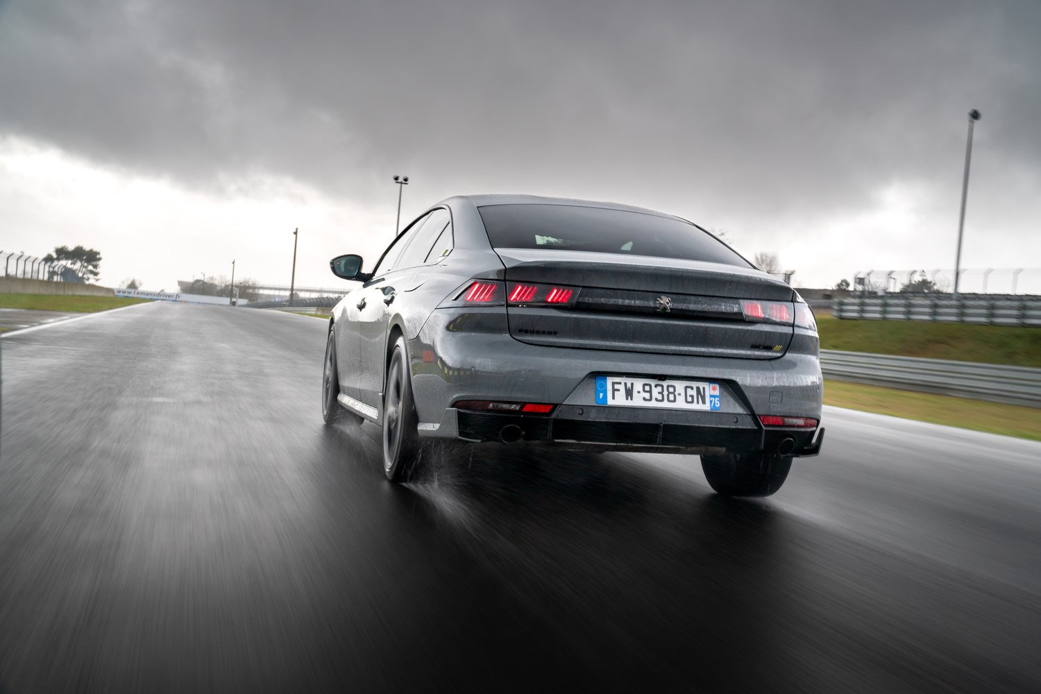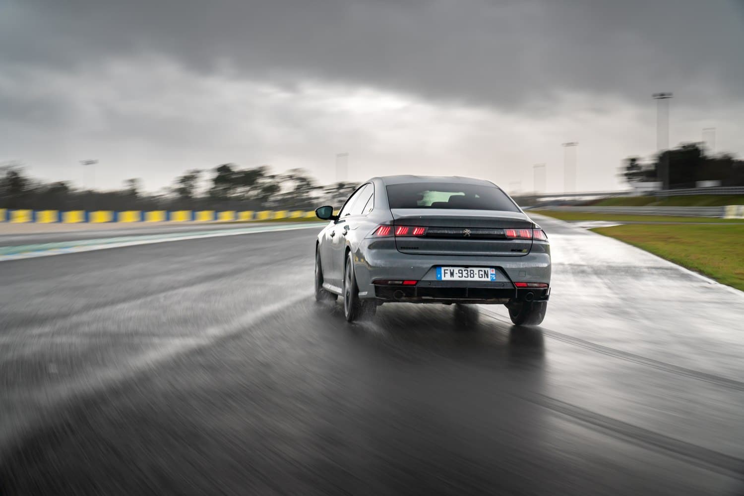 Qui dit motorisation hybride dit batteries. Et qui dit batteries dit poids immanquablement élevé. 1 850 kg à vide pour la berline, pour être exact. Une tare qui se ressent immédiatement sur le mouillé, ce que nous avons pu vérifier vu les trombes d’eau tombées lors de l’essai. Saine dans ses réactions, la PSE n’est pas joueuse quand on ne la provoque pas. Un dosage des gaz un peu optimiste en sortie de virage et les freinages tardifs se solderont immanquablement par un sous-virage marqué, la Peugeot ne pouvant lutter contre sa masse qui la tire vers l’extérieur. Mais si on veut la rendre mobile, un levé de pied en appui saura faire valser l’arrière de manière plutôt progressive, le poids aidant. Là où la Française se montre impériale en revanche, c’est au niveau de la motricité, impressionnante en toute circonstance.