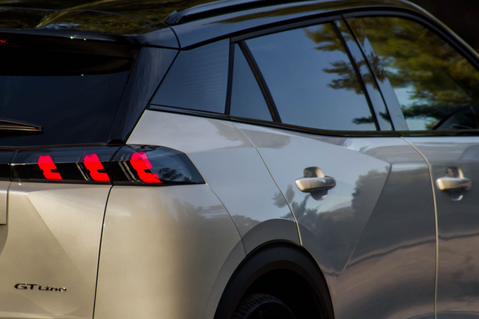 Le dernier montant noir laisse croire que le toit est flottant. Une astuce connue des designers, mais apportant un petit plus esthétique appréciable à mon goût. La poupe joue d’ailleurs sur ce même registre assez chic avec des optiques, formant comme trois griffes de chaque côté, reliées par un bandeau en noir brillant. La vitre du hayon est fortement inclinée pour apporter un certain dynamisme. C’est surtout la simplicité générale de la partie arrière qui me fait dire qu’il s’agit du côté le plus réussi du 3008 II. Seul le bouclier dénote en intégrant une barrette de chrome trop large et des imitations de sorties d’échappement.